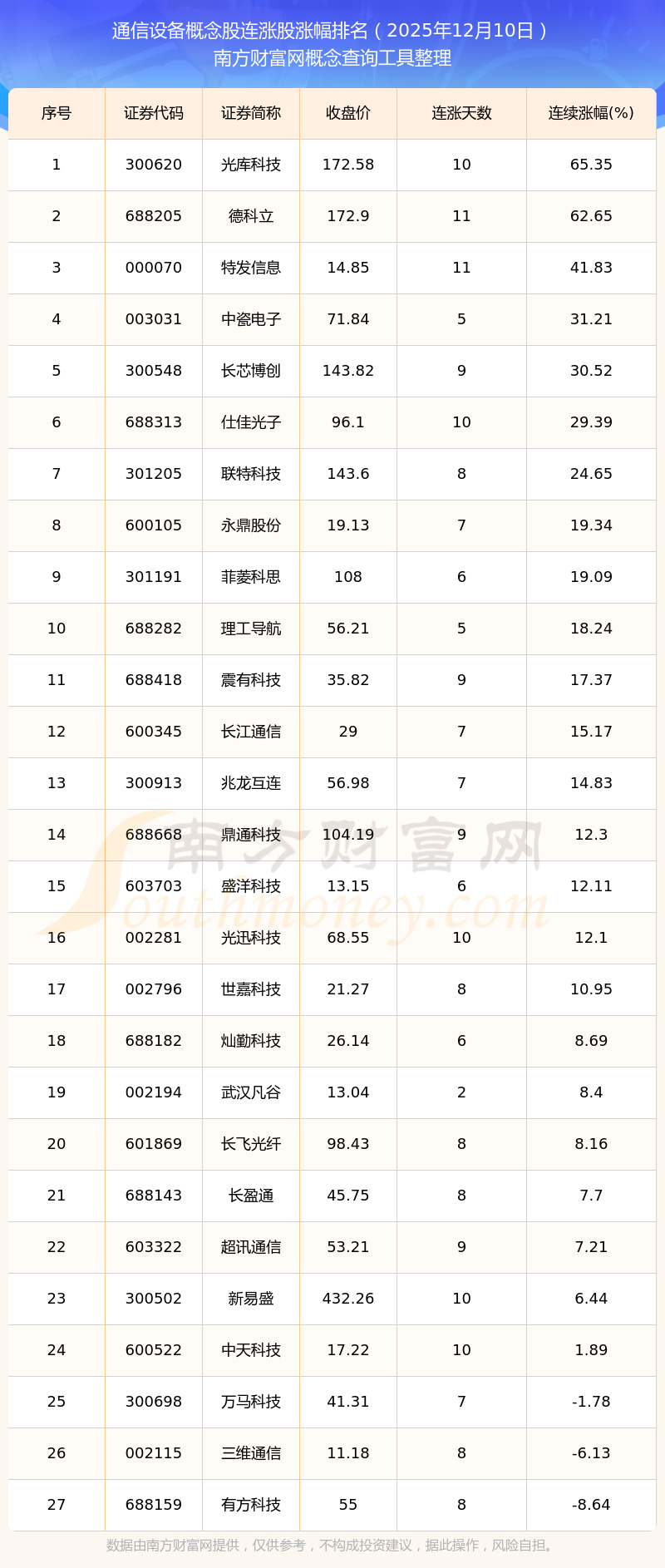 2025年12月10日通信设备概念股连涨股涨幅排名