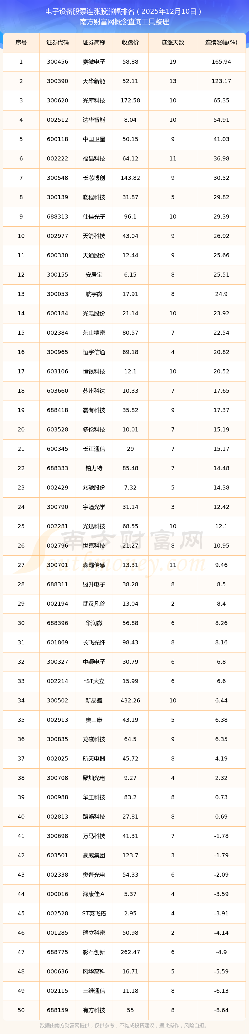根据南方财富网概念查询工具数据统计,截止2025年12月10日收盘,电子设备股票共有52只个股实现连涨。其中连续涨幅较大的个股有赛微电子、天华新能、光库科技等,连续涨幅分别为165.94%、123.17%、65.35%。