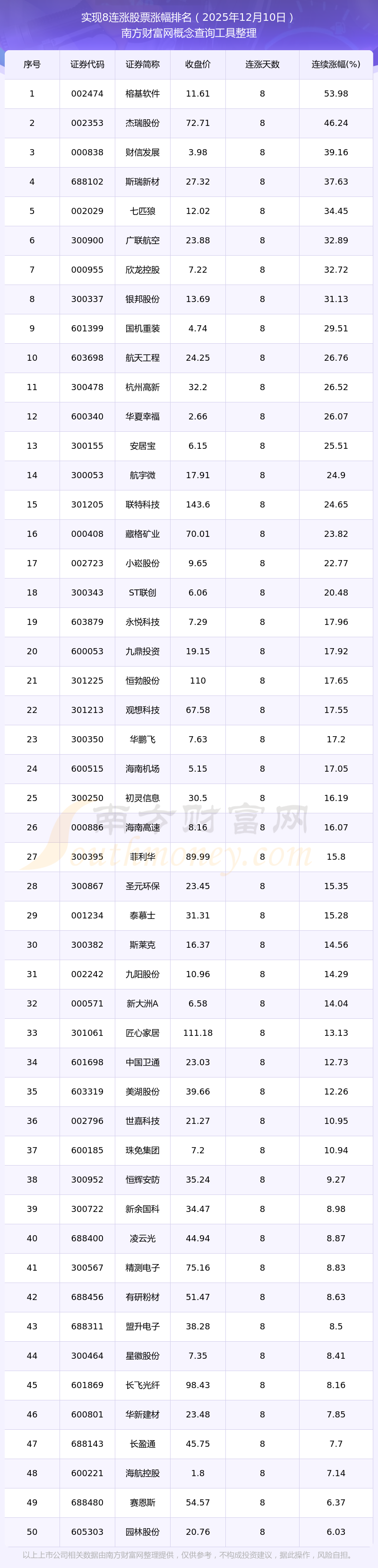 根据南方财富网概念查询工具数据统计,截止2025年12月10日收盘,共有73只个股实现8天连涨。其中连续涨幅较大的个股有榕基软件、杰瑞股份、财信发展等,连续涨幅分别为53.98%、46.24%、39.16%。