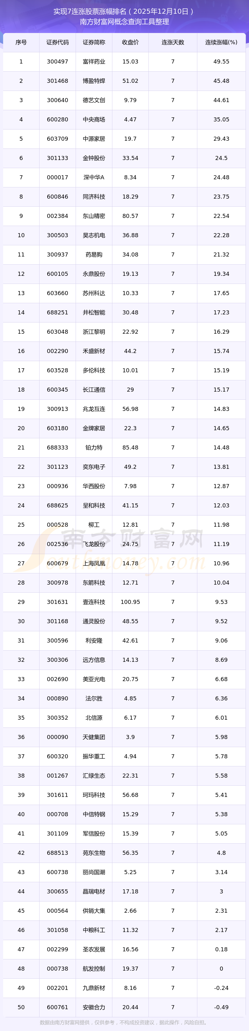 根据南方财富网概念查询工具数据统计,截止2025年12月10日收盘,共有64只个股实现7天连涨。其中连续涨幅较大的个股有富祥药业、博盈特焊、德艺文创等,连续涨幅分别为49.55%、45.48%、44.61%。