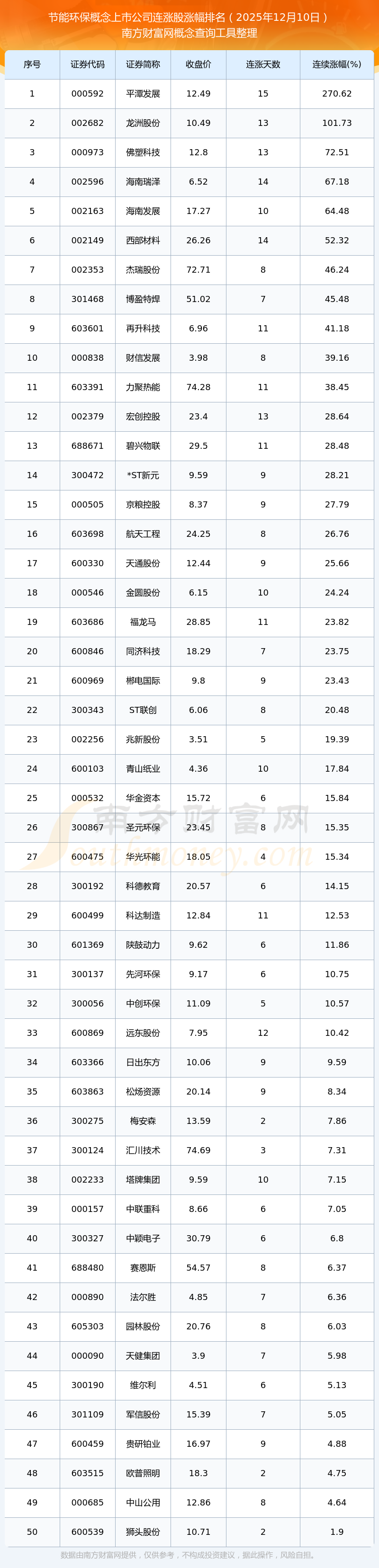 根据南方财富网概念查询工具数据统计,截止2025年12月10日收盘,节能环保概念上市公司共有76只个股实现连涨。其中连续涨幅较大的个股有平潭发展、龙洲股份、佛塑科技等,连续涨幅分别为270.62%、101.73%、72.51%。