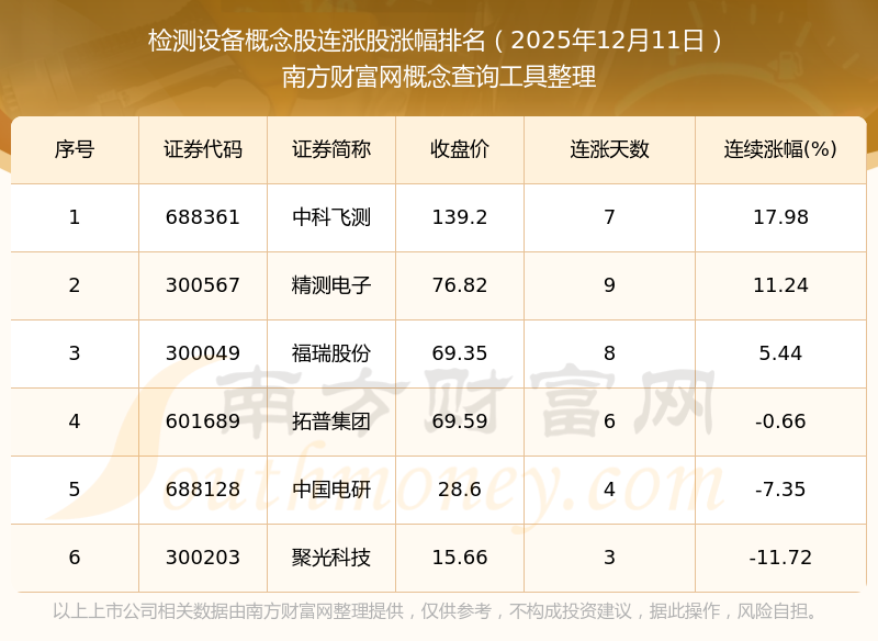 2025年12月11日检测设备概念股连涨股涨幅排名