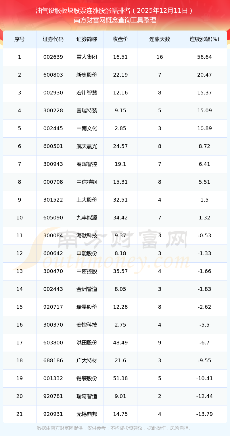 2025年12月11日油气设服板块股票连涨股涨幅排名