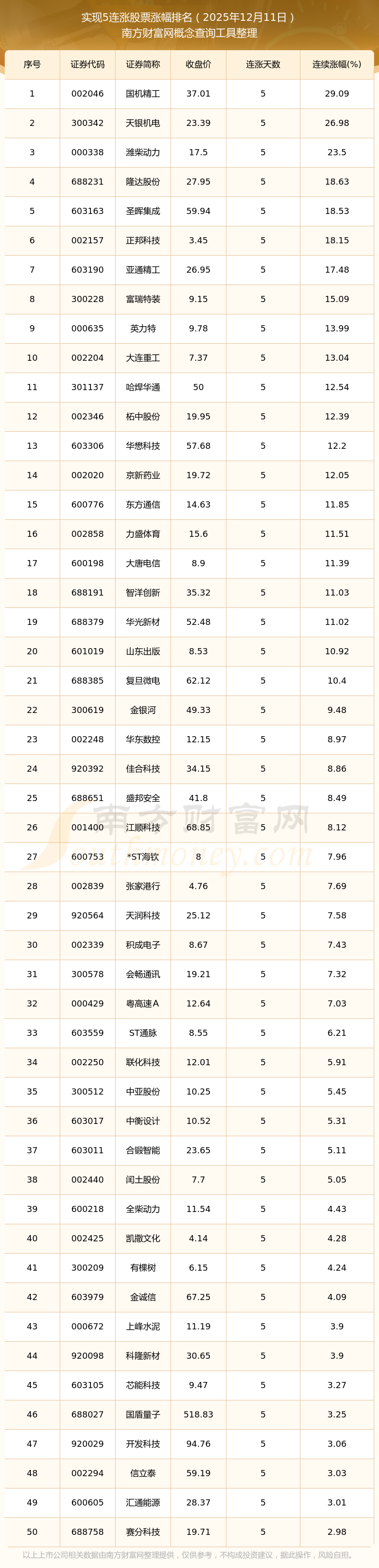 根据南方财富网概念查询工具数据统计,截止2025年12月11日收盘,共有144只个股实现5天连涨。其中连续涨幅较大的个股有国机精工、天银机电、潍柴动力等,连续涨幅分别为29.09%、26.98%、23.50%。