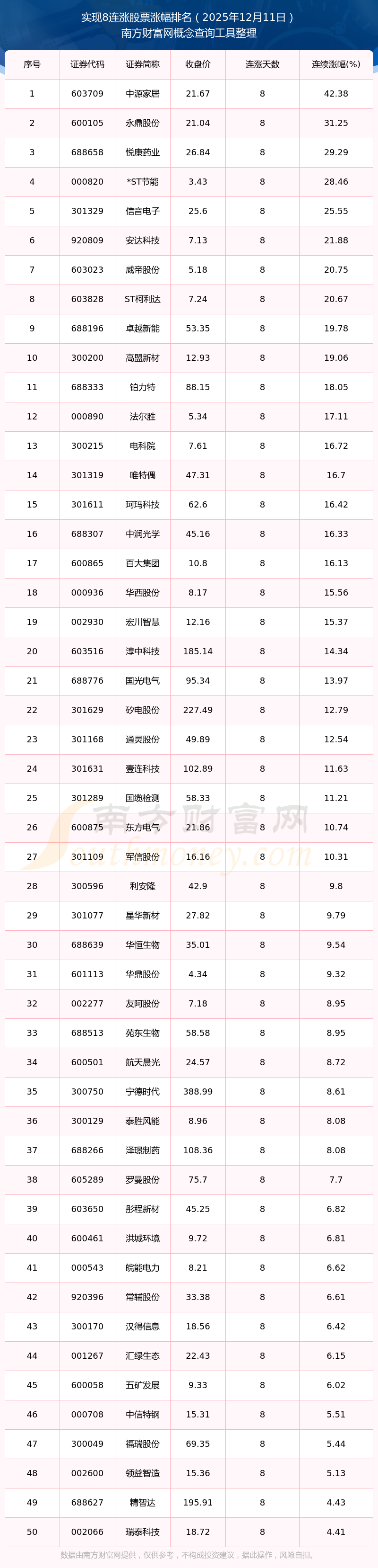 2025年12月11日实现8连涨股票涨幅排名