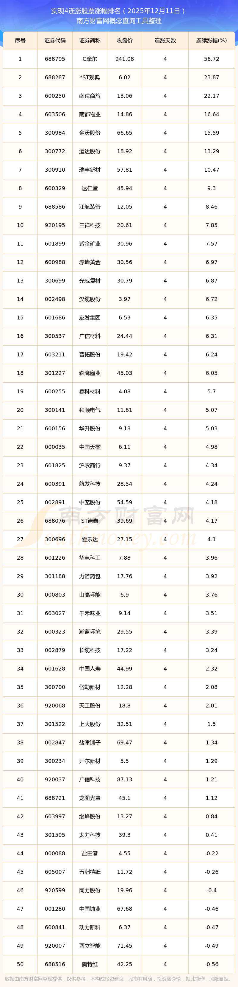 根据南方财富网概念查询工具数据统计,截止2025年12月11日收盘,共有133只个股实现4天连涨。其中连续涨幅较大的个股有C摩尔、*ST观典、南京商旅等,连续涨幅分别为56.72%、23.87%、22.17%。