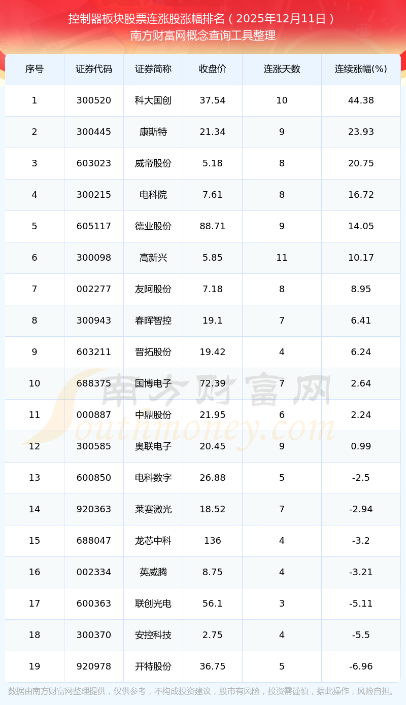 2025年12月11日控制器板块股票连涨股涨幅排名