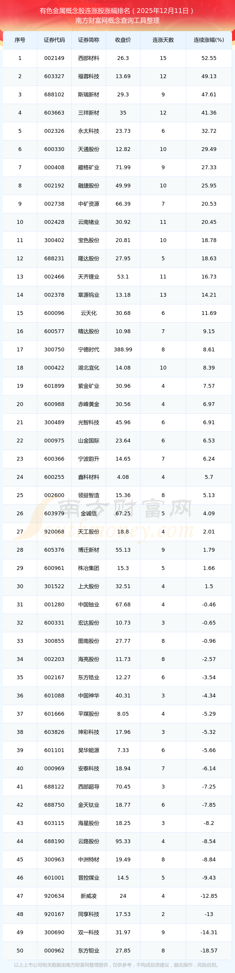 根据南方财富网概念查询工具数据统计,截止2025年12月11日收盘,有色金属概念股共有50只个股实现连涨。其中连续涨幅较大的个股有西部材料、福蓉科技、斯瑞新材等,连续涨幅分别为52.55%、49.13%、47.61%。