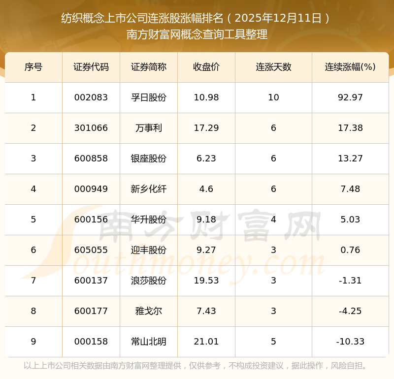 2025年12月11日纺织概念上市公司连涨股涨幅排名