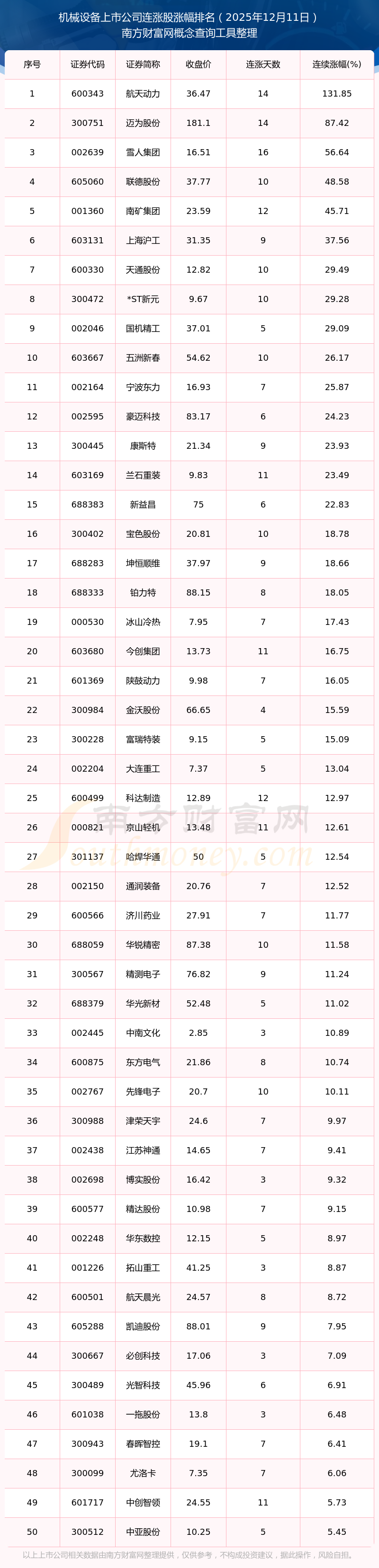 2025年12月11日机械设备上市公司连涨股涨幅排名