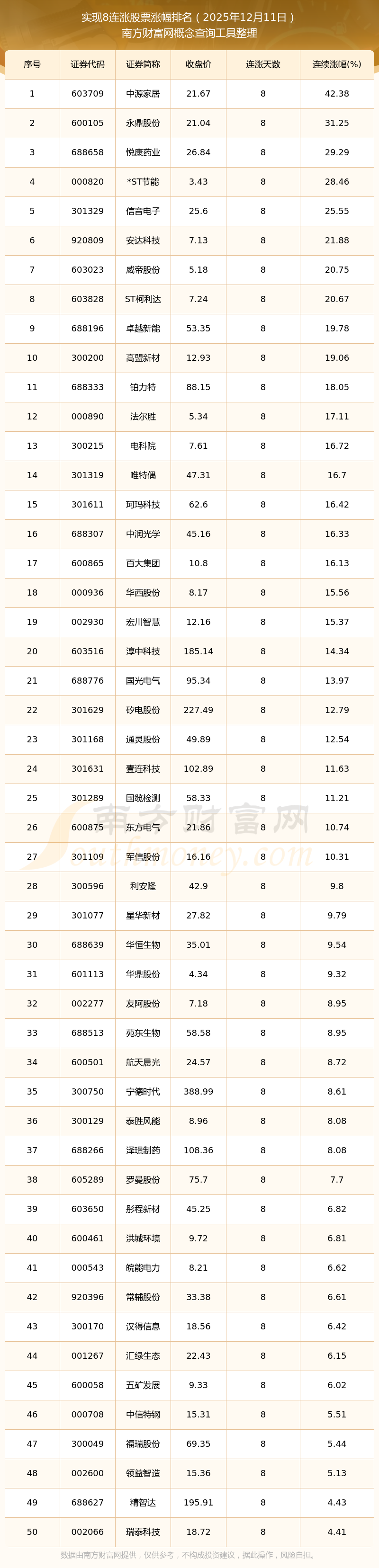 根据南方财富网概念查询工具数据统计,截止2025年12月11日收盘,共有91只个股实现8天连涨。其中连续涨幅较大的个股有中源家居、永鼎股份、悦康药业等,连续涨幅分别为42.38%、31.25%、29.29%。
