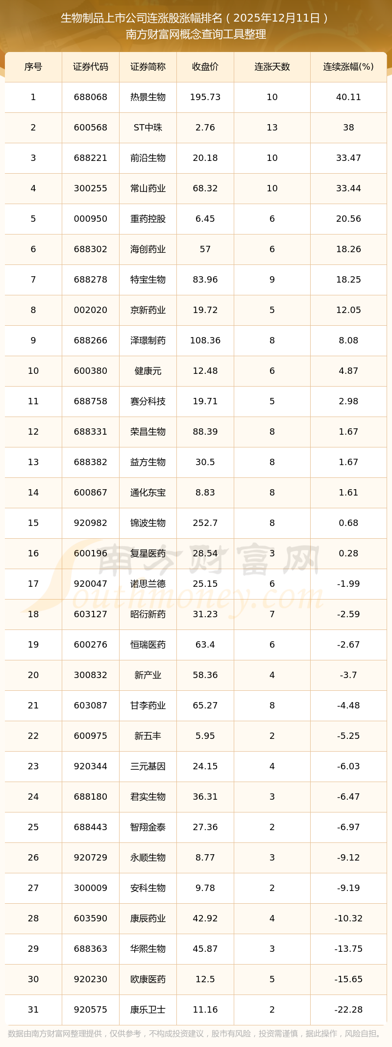 2025年12月11日生物制品上市公司连涨股涨幅排名