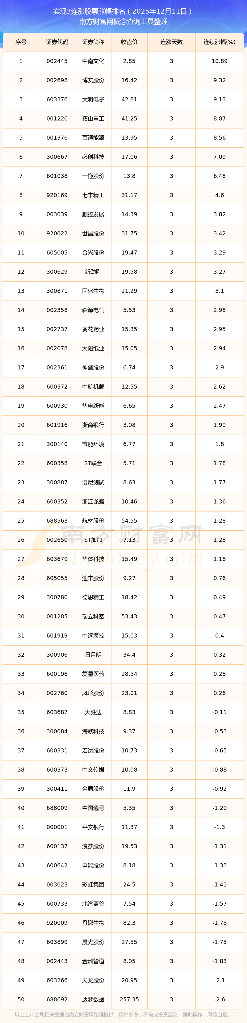 根据南方财富网概念查询工具数据统计,截止2025年12月11日收盘,共有144只个股实现3天连涨。其中连续涨幅较大的个股有中南文化、博实股份、大明电子等,连续涨幅分别为10.89%、9.32%、9.13%。