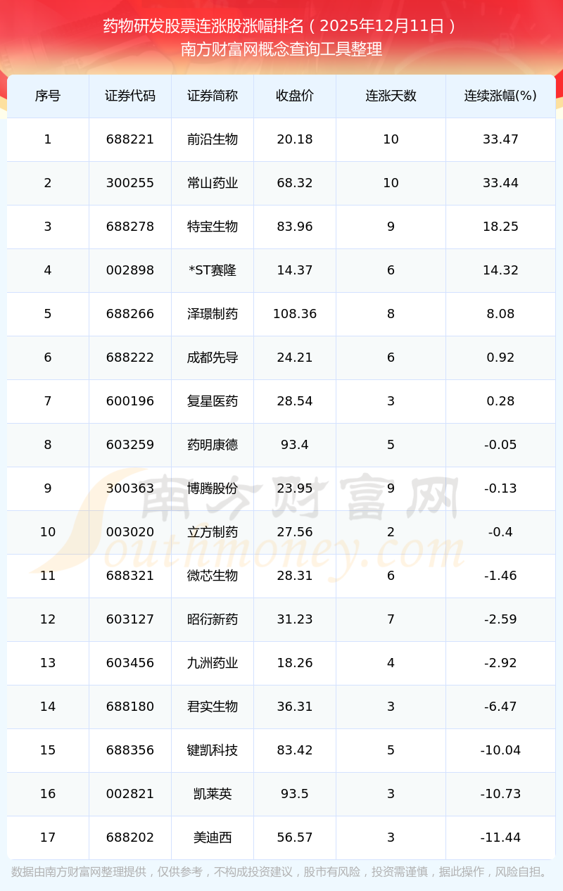 根据南方财富网概念查询工具数据统计,截止2025年12月11日收盘,药物研发股票共有17只个股实现连涨。其中连续涨幅较大的个股有前沿生物、常山药业、特宝生物等,连续涨幅分别为33.47%、33.44%、18.25%。