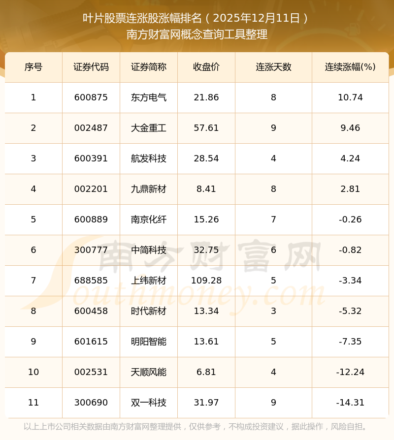 根据南方财富网概念查询工具数据统计,截止2025年12月11日收盘,叶片股票共有11只个股实现连涨。其中连续涨幅较大的个股有东方电气、大金重工、航发科技等,连续涨幅分别为10.74%、9.46%、4.24%。