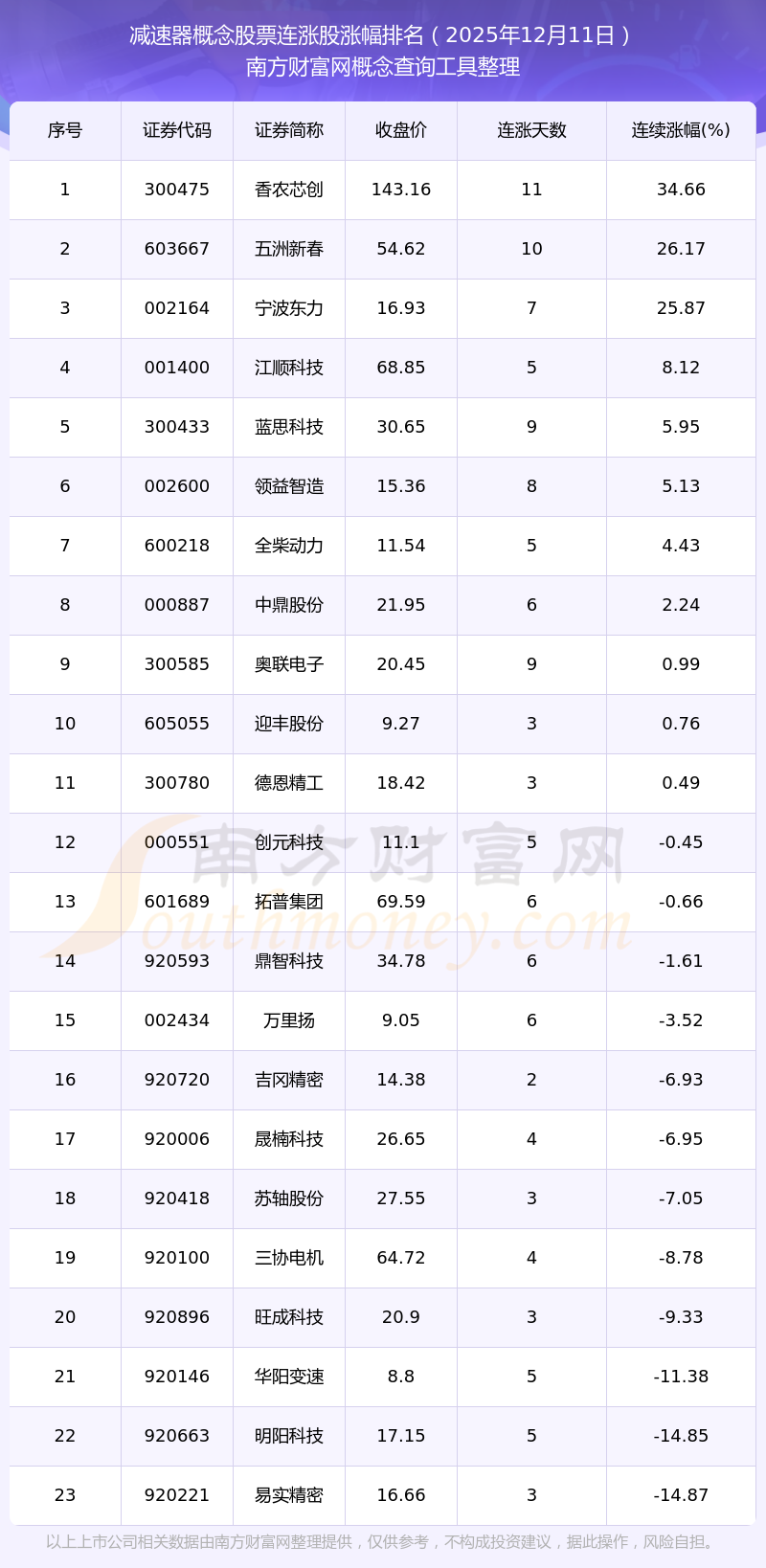 2025年12月11日减速器概念股票连涨股涨幅排名