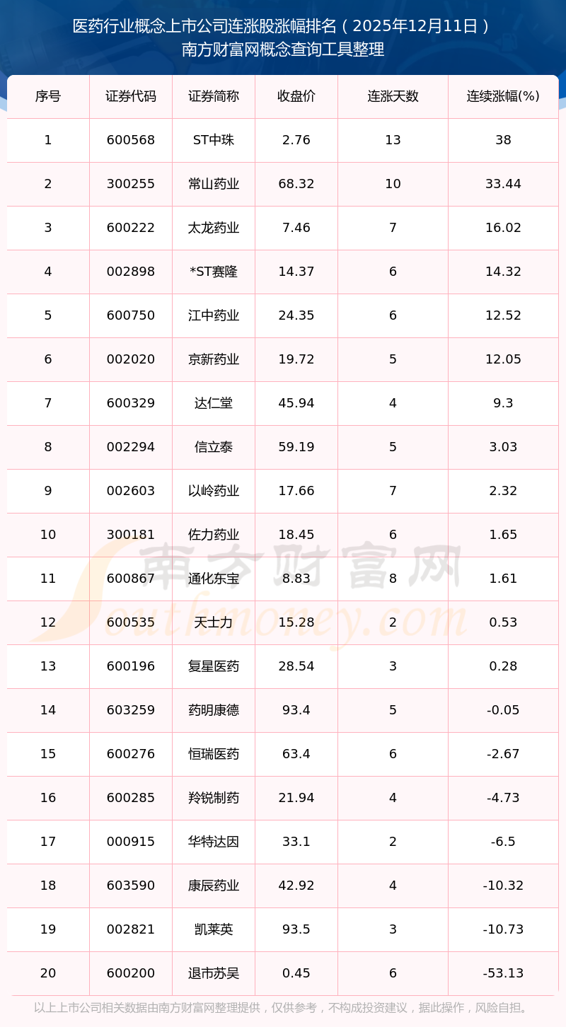 根据南方财富网概念查询工具数据统计,截止2025年12月11日收盘,医药行业概念上市公司共有20只个股实现连涨。其中连续涨幅较大的个股有ST中珠、常山药业、太龙药业等,连续涨幅分别为38.00%、33.44%、16.02%。