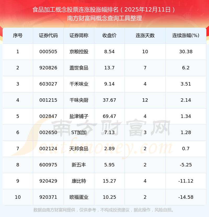 2025年12月11日食品加工概念股票连涨股涨幅排名