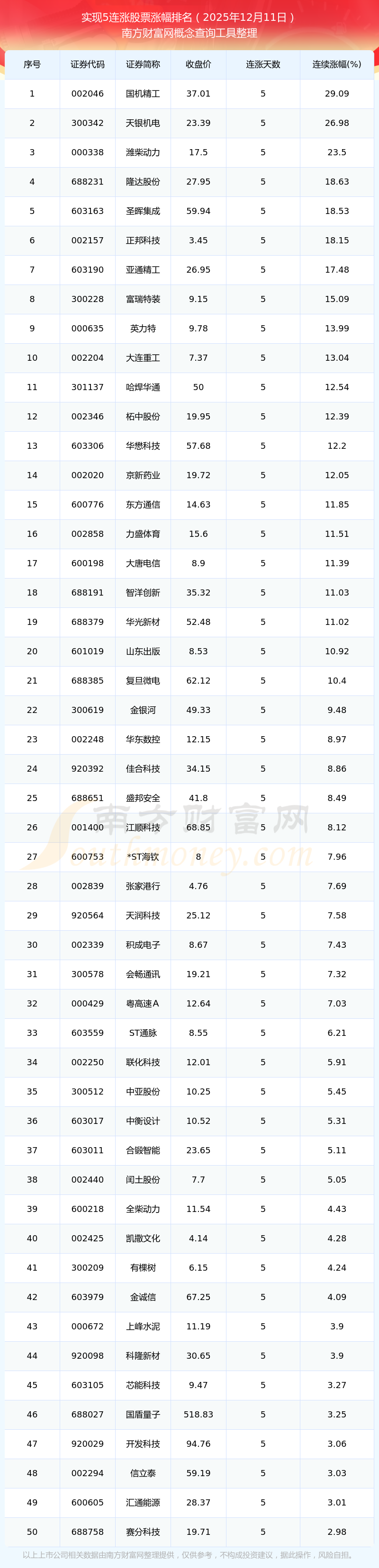 根据南方财富网概念查询工具数据统计,截止2025年12月11日收盘,共有144只个股实现5天连涨。其中连续涨幅较大的个股有国机精工、天银机电、潍柴动力等,连续涨幅分别为29.09%、26.98%、23.50%。