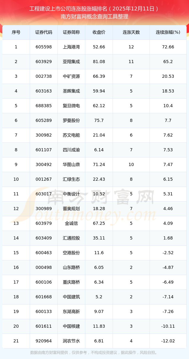 根据南方财富网概念查询工具数据统计,截止2025年12月11日收盘,工程建设上市公司共有21只个股实现连涨。其中连续涨幅较大的个股有上海港湾、亚翔集成、中矿资源等,连续涨幅分别为72.66%、65.20%、20.53%。