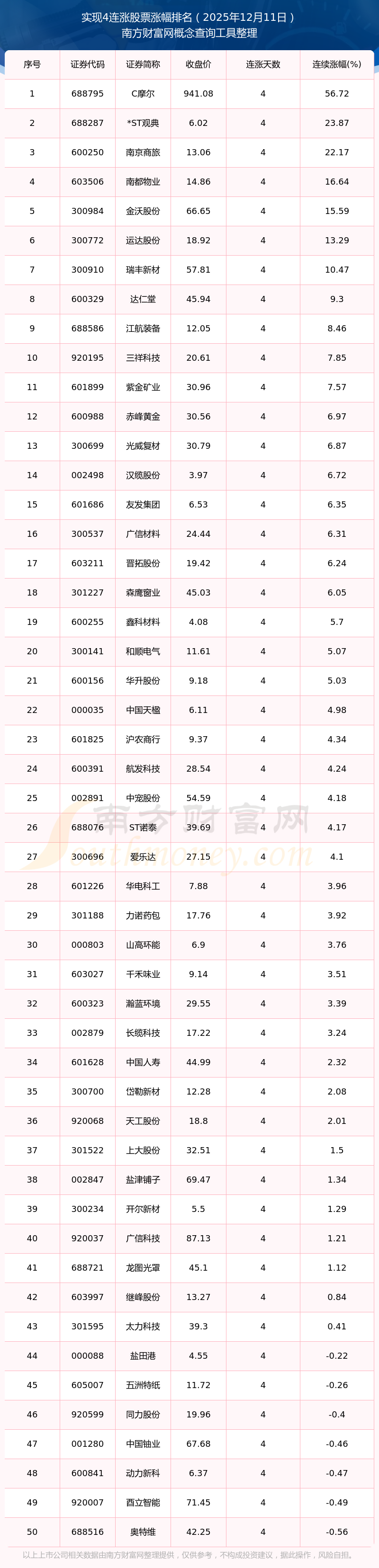 根据南方财富网概念查询工具数据统计,截止2025年12月11日收盘,共有133只个股实现4天连涨。其中连续涨幅较大的个股有C摩尔、*ST观典、南京商旅等,连续涨幅分别为56.72%、23.87%、22.17%。