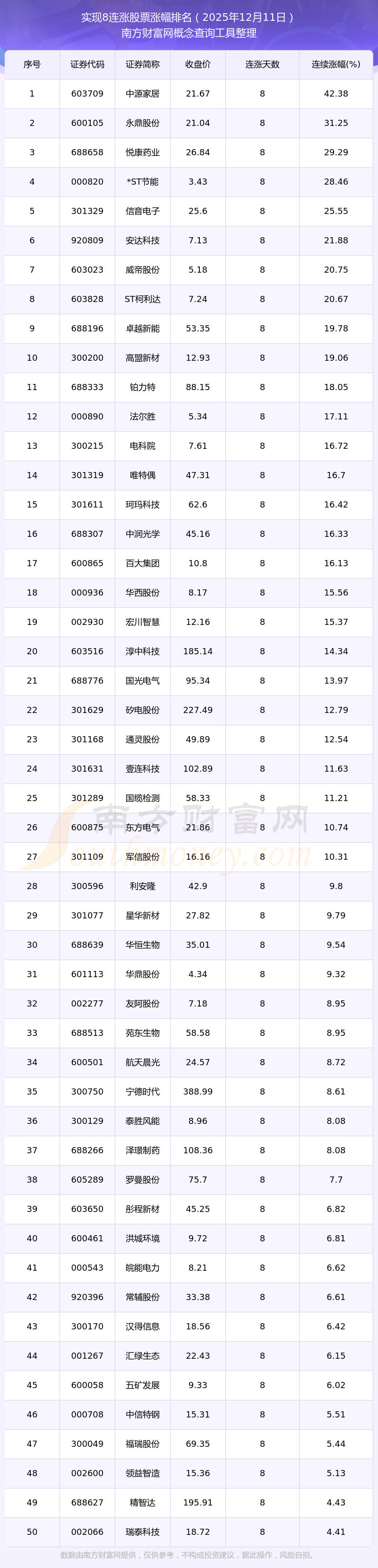 根据南方财富网概念查询工具数据统计,截止2025年12月11日收盘,共有91只个股实现8天连涨。其中连续涨幅较大的个股有中源家居、永鼎股份、悦康药业等,连续涨幅分别为42.38%、31.25%、29.29%。