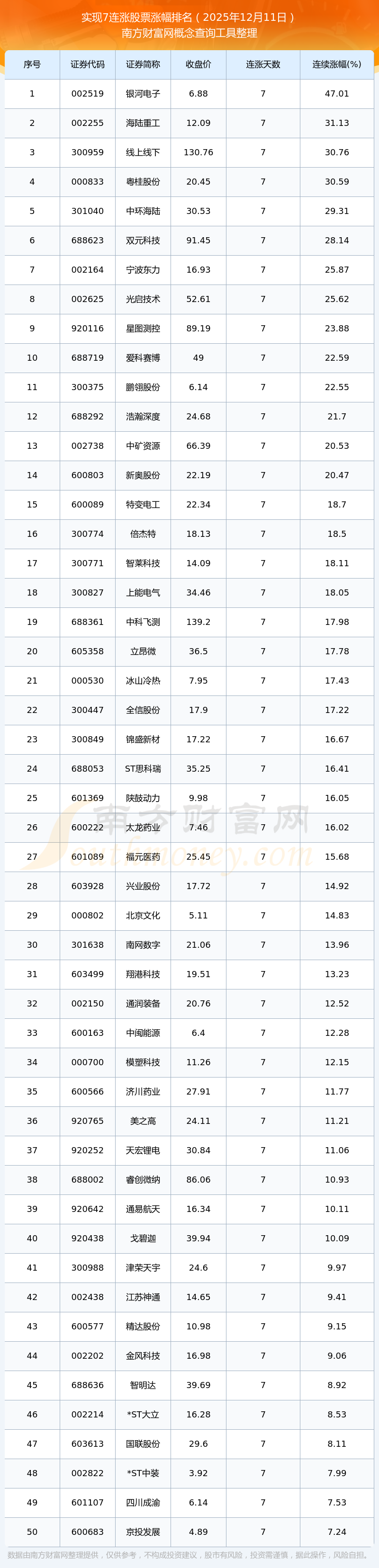 根据南方财富网概念查询工具数据统计,截止2025年12月11日收盘,共有107只个股实现7天连涨。其中连续涨幅较大的个股有银河电子、海陆重工、线上线下等,连续涨幅分别为47.01%、31.13%、30.76%。