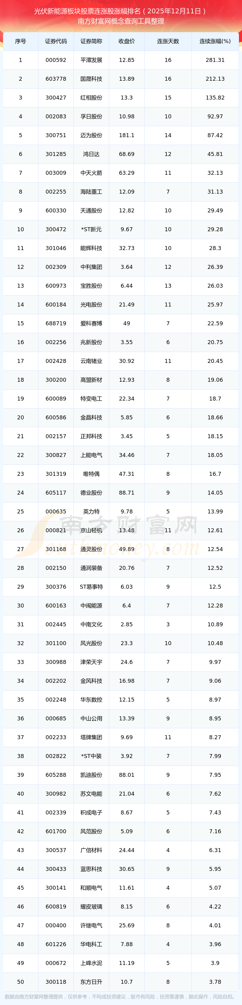 根据南方财富网概念查询工具数据统计,截止2025年12月11日收盘,光伏新能源板块股票共有95只个股实现连涨。其中连续涨幅较大的个股有平潭发展、国晟科技、红相股份等,连续涨幅分别为281.31%、212.13%、135.82%。