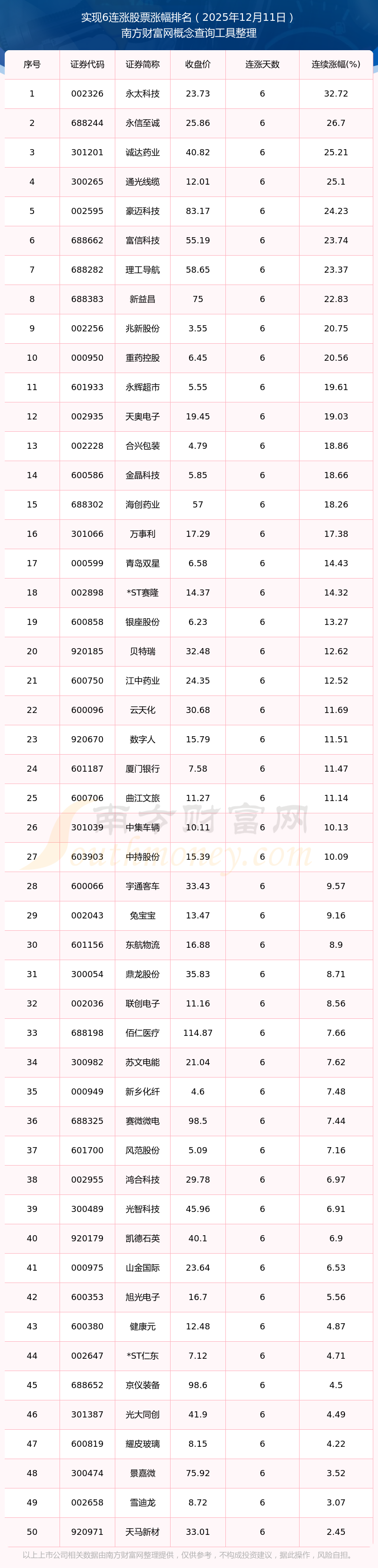 根据南方财富网概念查询工具数据统计,截止2025年12月11日收盘,共有101只个股实现6天连涨。其中连续涨幅较大的个股有永太科技、永信至诚、诚达药业等,连续涨幅分别为32.72%、26.70%、25.21%。