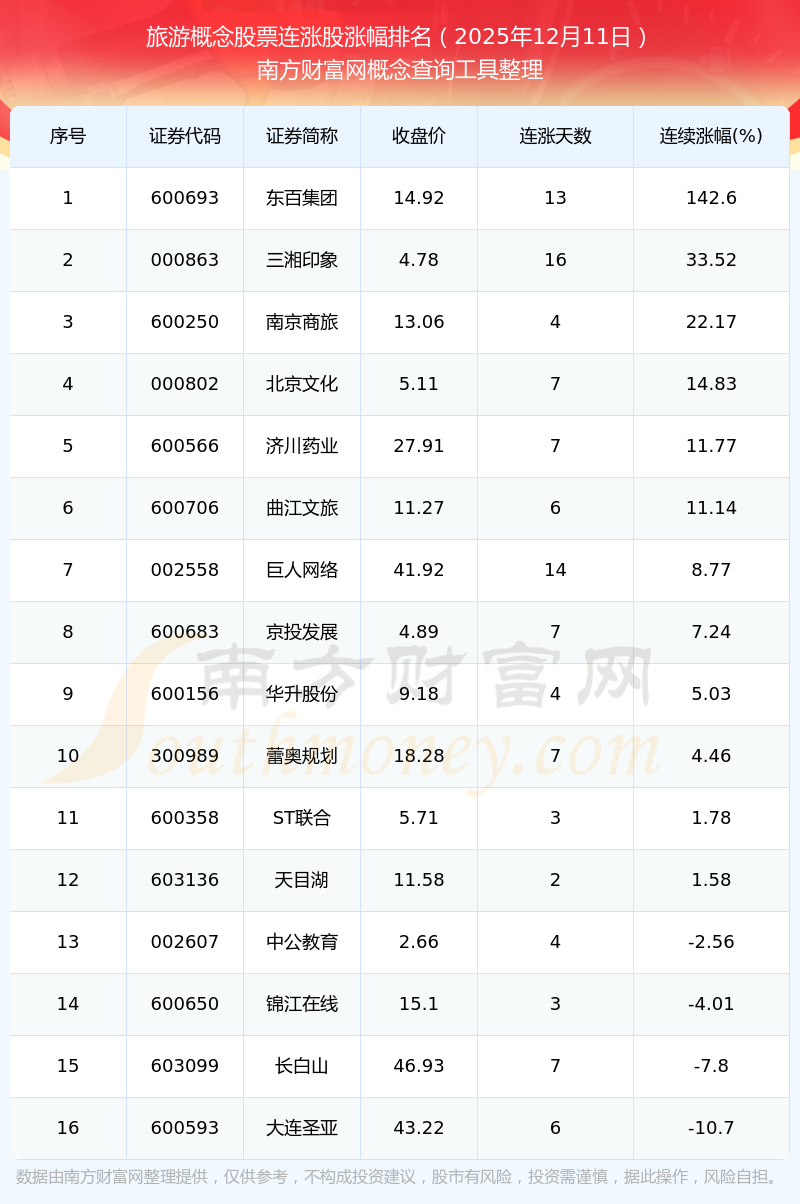 根据南方财富网概念查询工具数据统计,截止2025年12月11日收盘,旅游概念股票共有16只个股实现连涨。其中连续涨幅较大的个股有东百集团、三湘印象、南京商旅等,连续涨幅分别为142.60%、33.52%、22.17%。