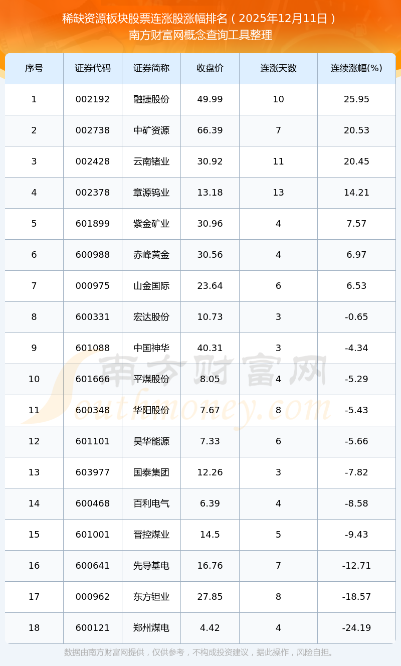 2025年12月11日稀缺资源板块股票连涨股涨幅排名