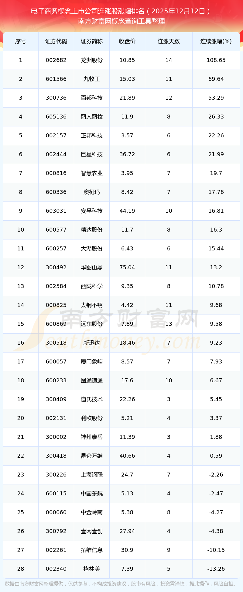 根据南方财富网概念查询工具数据统计,截止2025年12月12日收盘,电子商务概念上市公司共有28只个股实现连涨。其中连续涨幅较大的个股有龙洲股份、九牧王、百邦科技等,连续涨幅分别为108.65%、69.64%、53.29%。