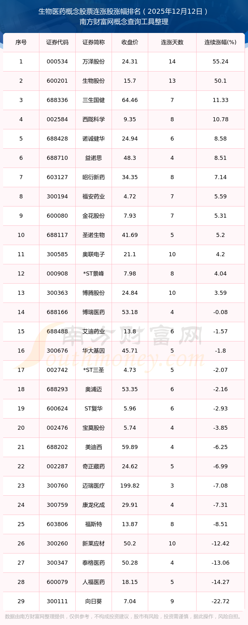 2025年12月12日生物医药概念股票连涨股涨幅排名
