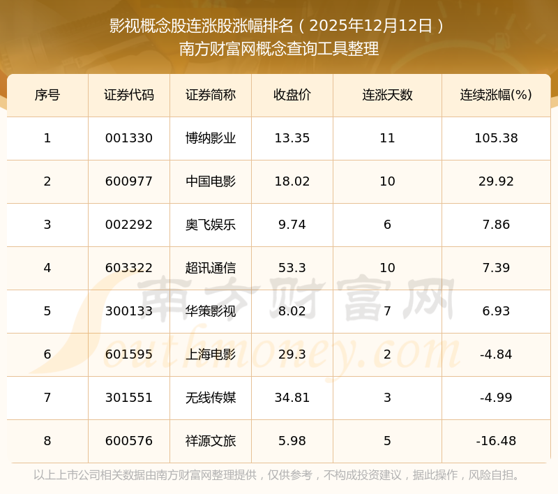 根据南方财富网概念查询工具数据统计,截止2025年12月12日收盘,影视概念股共有8只个股实现连涨。其中连续涨幅较大的个股有博纳影业、中国电影、奥飞娱乐等,连续涨幅分别为105.38%、29.92%、7.86%。