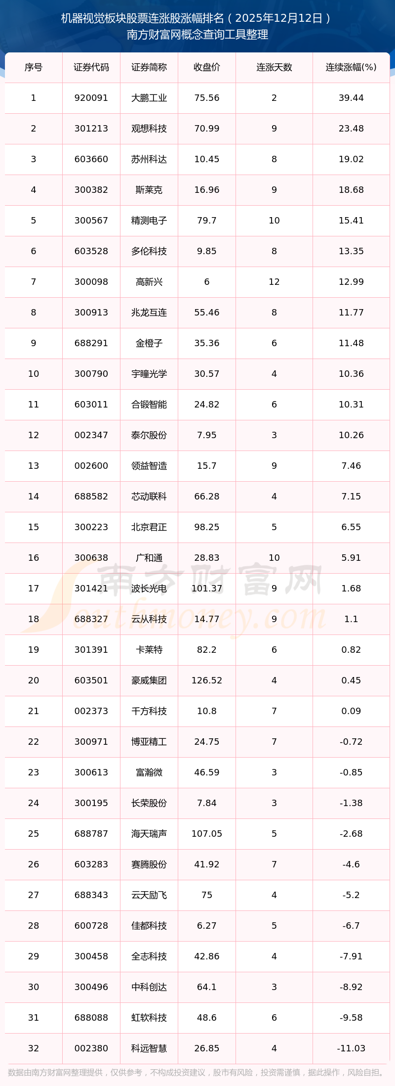 2025年12月12日机器视觉板块股票连涨股涨幅排名