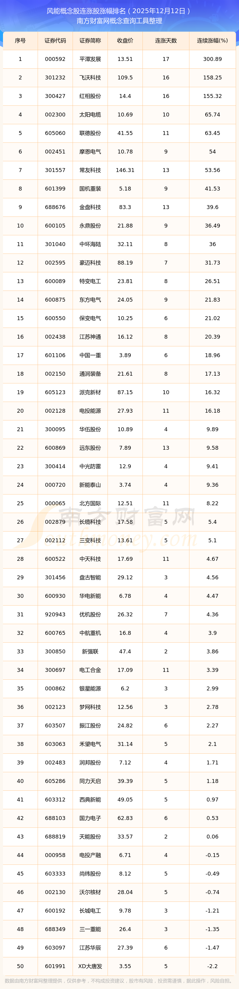 根据南方财富网概念查询工具数据统计,截止2025年12月12日收盘,风能概念股共有75只个股实现连涨。其中连续涨幅较大的个股有平潭发展、飞沃科技、红相股份等,连续涨幅分别为300.89%、158.25%、155.32%。