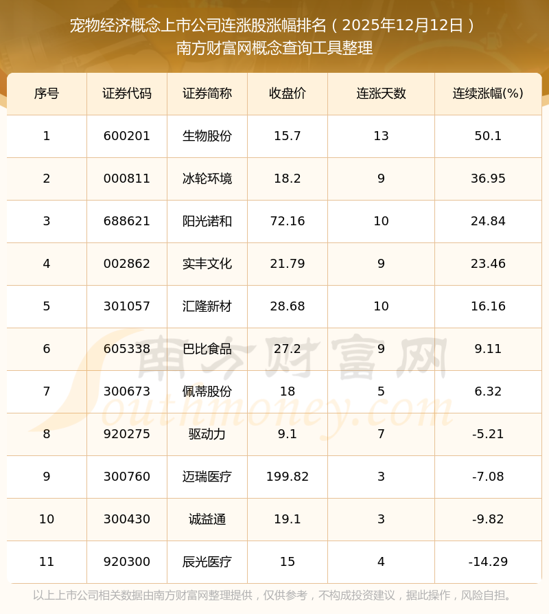 根据南方财富网概念查询工具数据统计,截止2025年12月12日收盘,宠物经济概念上市公司共有11只个股实现连涨。其中连续涨幅较大的个股有生物股份、冰轮环境、阳光诺和等,连续涨幅分别为50.10%、36.95%、24.84%。