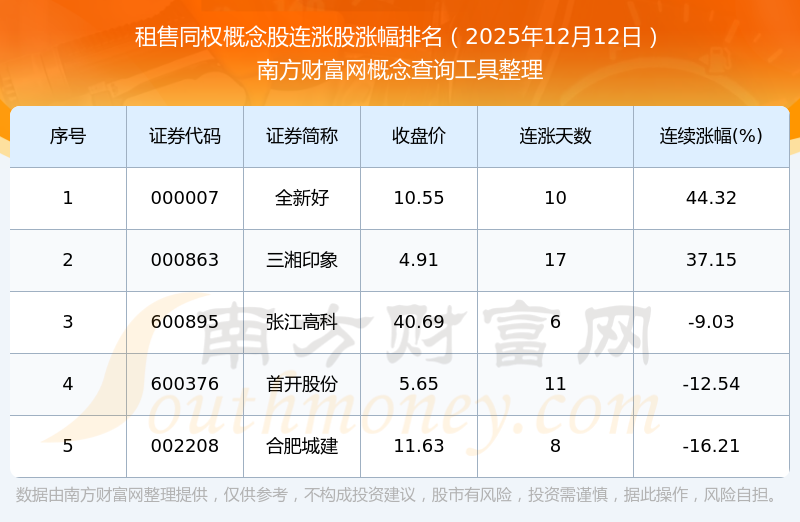 2025年12月12日租售同权概念股连涨股涨幅排名