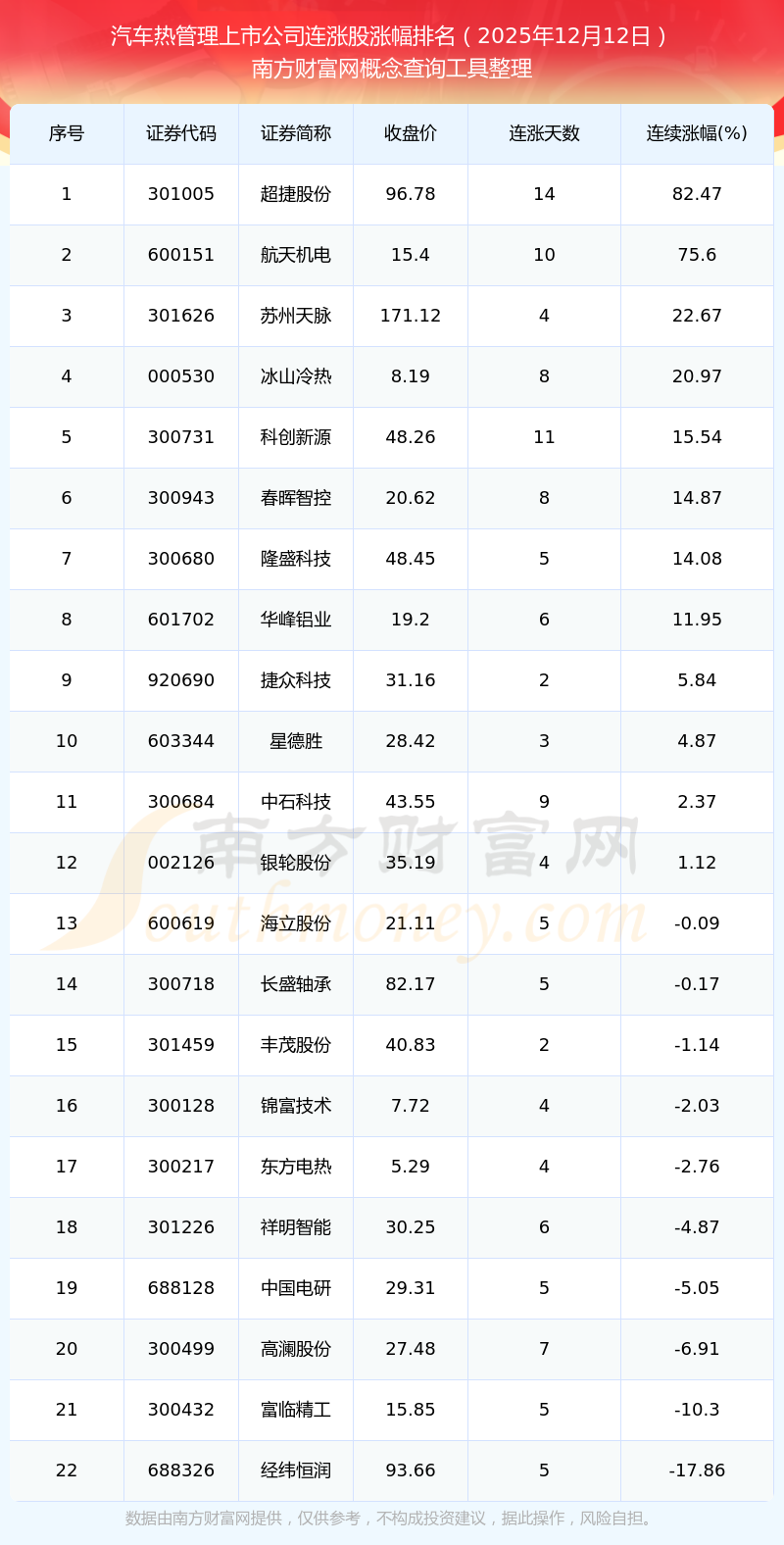 根据南方财富网概念查询工具数据统计,截止2025年12月12日收盘,汽车热管理上市公司共有22只个股实现连涨。其中连续涨幅较大的个股有超捷股份、航天机电、苏州天脉等,连续涨幅分别为82.47%、75.60%、22.67%。
