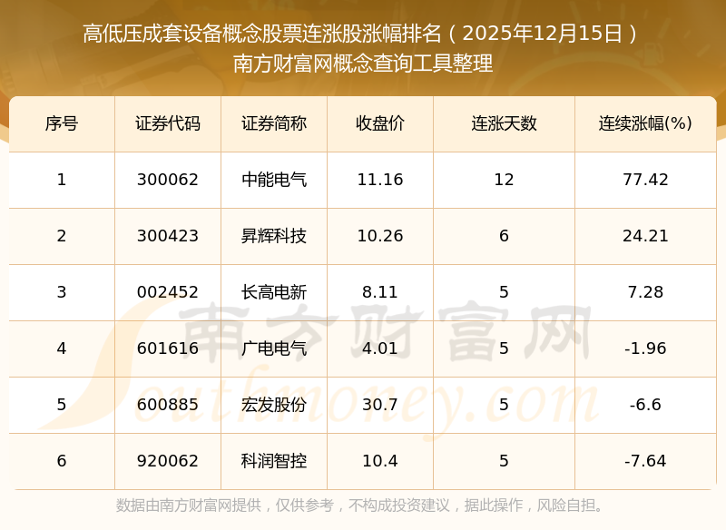 根据南方财富网概念查询工具数据统计,截止2025年12月15日收盘,高低压成套设备概念股票共有6只个股实现连涨。其中连续涨幅较大的个股有中能电气、昇辉科技、长高电新等,连续涨幅分别为77.42%、24.21%、7.28%。