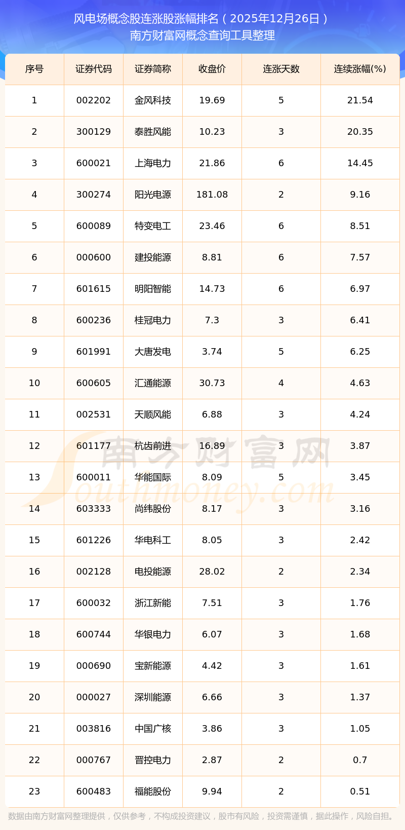 2025年12月26日风电场概念股连涨股涨幅排名