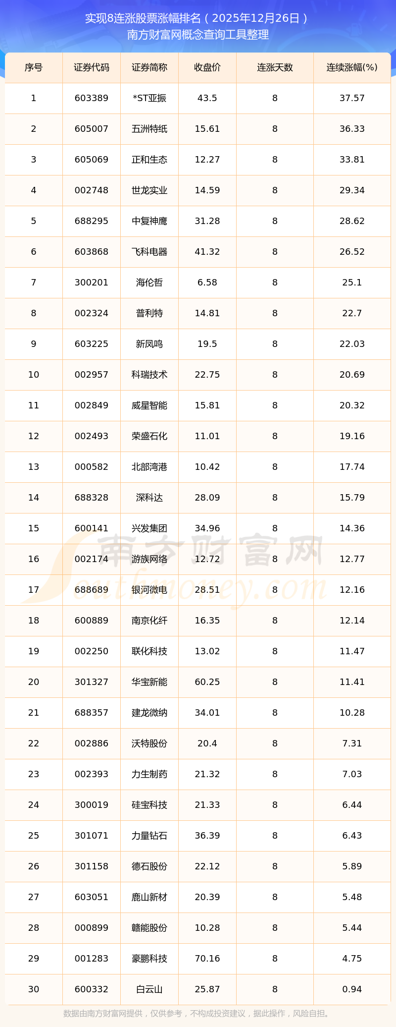 根据南方财富网概念查询工具数据统计,截止2025年12月26日收盘,共有30只个股实现8天连涨。其中连续涨幅较大的个股有*ST亚振、五洲特纸、正和生态等,连续涨幅分别为37.57%、36.33%、33.81%。