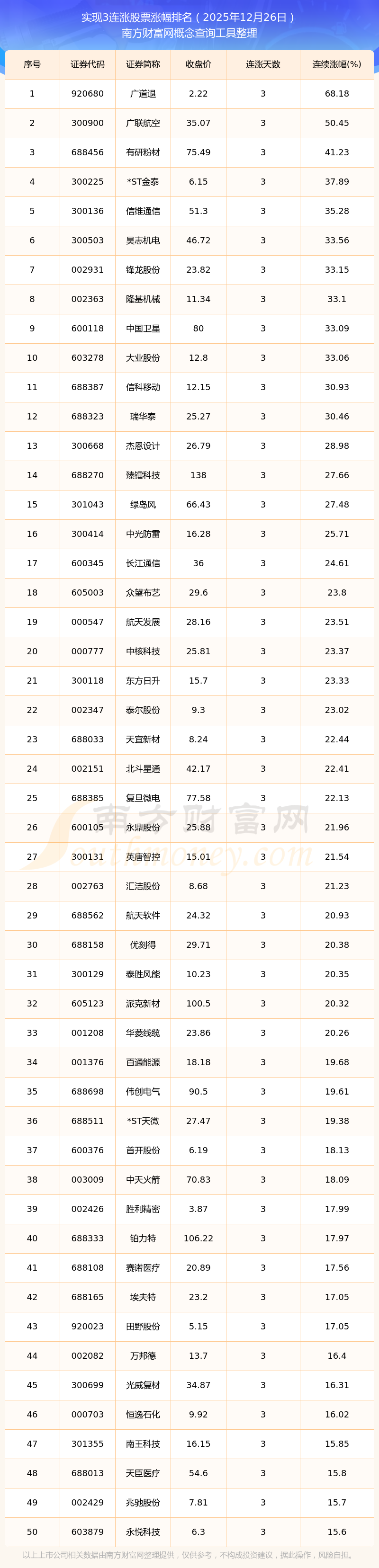 根据南方财富网概念查询工具数据统计,截止2025年12月26日收盘,共有727只个股实现3天连涨。其中连续涨幅较大的个股有广道退、广联航空、有研粉材等,连续涨幅分别为68.18%、50.45%、41.23%。