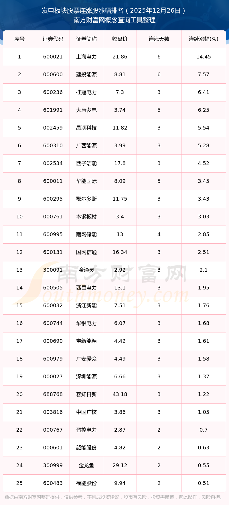 根据南方财富网概念查询工具数据统计,截止2025年12月26日收盘,发电板块股票共有25只个股实现连涨。其中连续涨幅较大的个股有上海电力、建投能源、桂冠电力等,连续涨幅分别为14.45%、7.57%、6.41%。