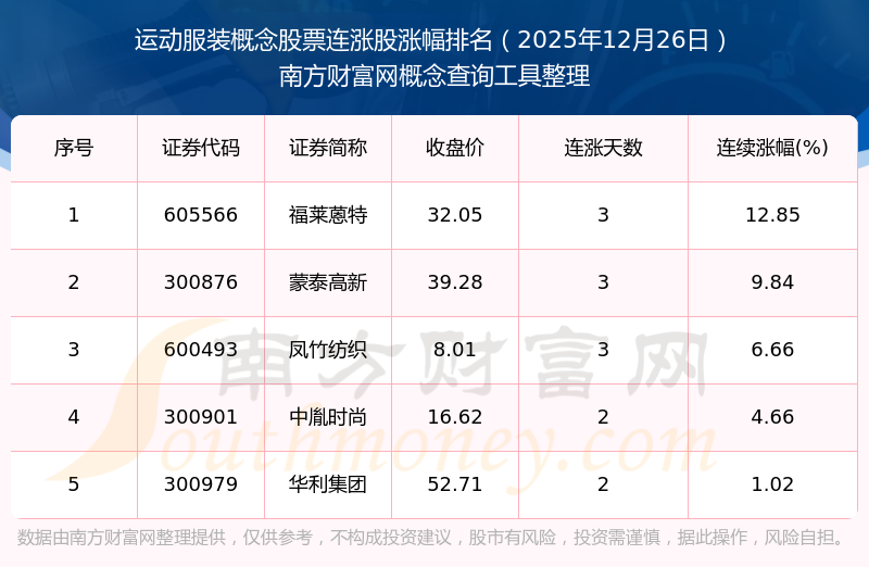 2025年12月26日运动服装概念股票连涨股涨幅排名