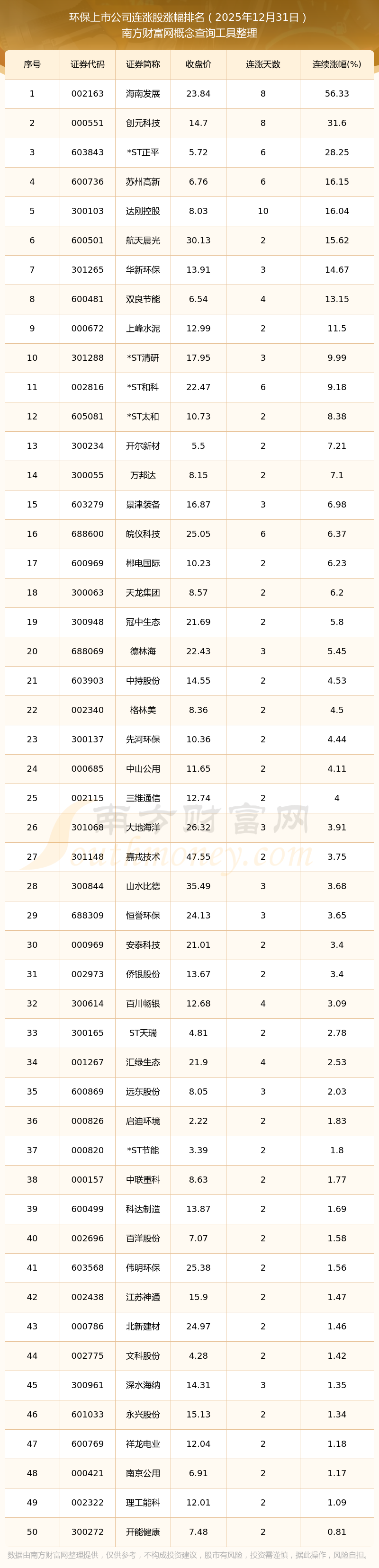 根据南方财富网概念查询工具数据统计,截止2025年12月31日收盘,环保上市公司共有54只个股实现连涨。其中连续涨幅较大的个股有海南发展、创元科技、*ST正平等,连续涨幅分别为56.33%、31.60%、28.25%。