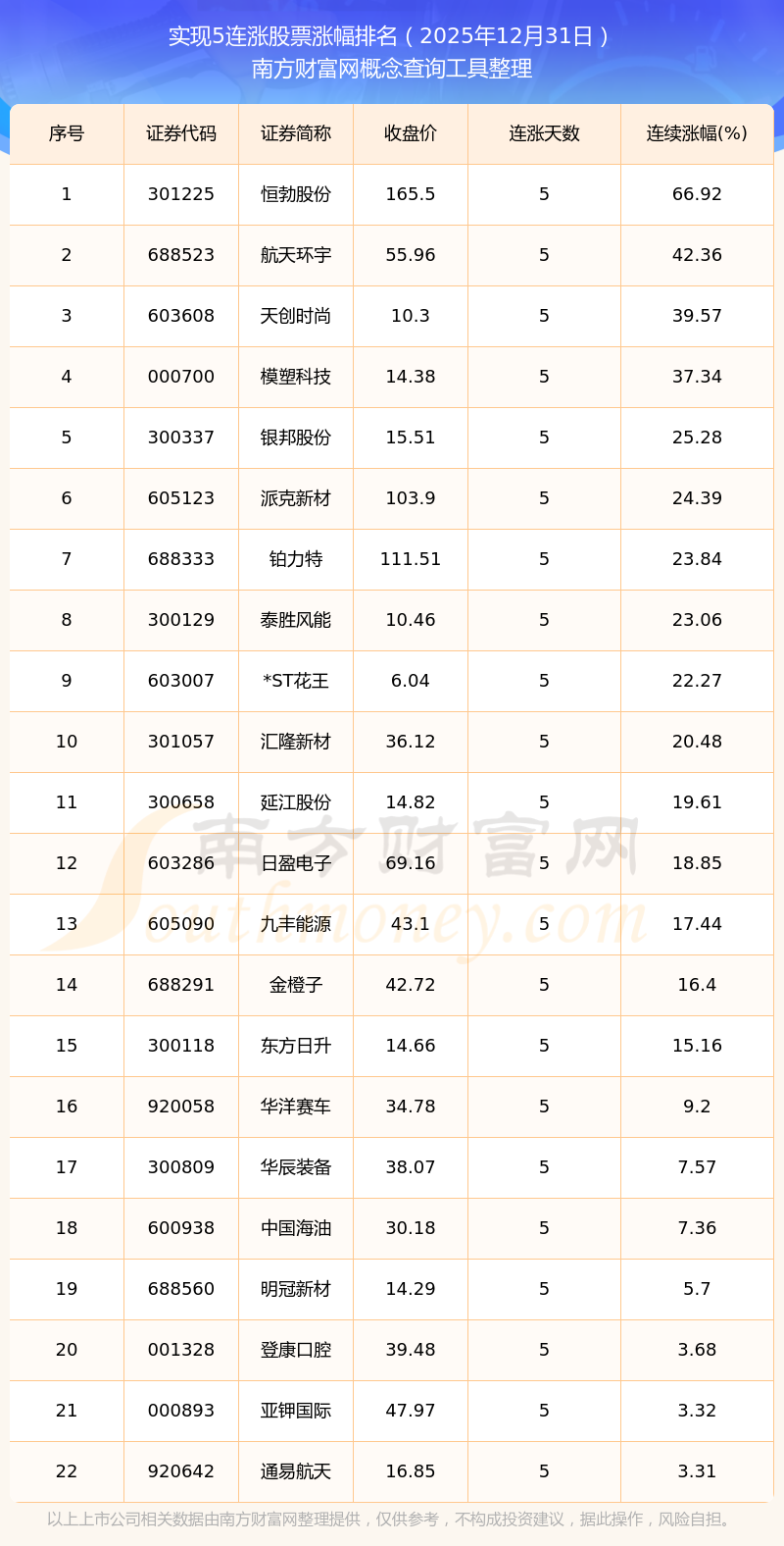 根据南方财富网概念查询工具数据统计,截止2025年12月31日收盘,共有22只个股实现5天连涨。其中连续涨幅较大的个股有恒勃股份、航天环宇、天创时尚等,连续涨幅分别为66.92%、42.36%、39.57%。