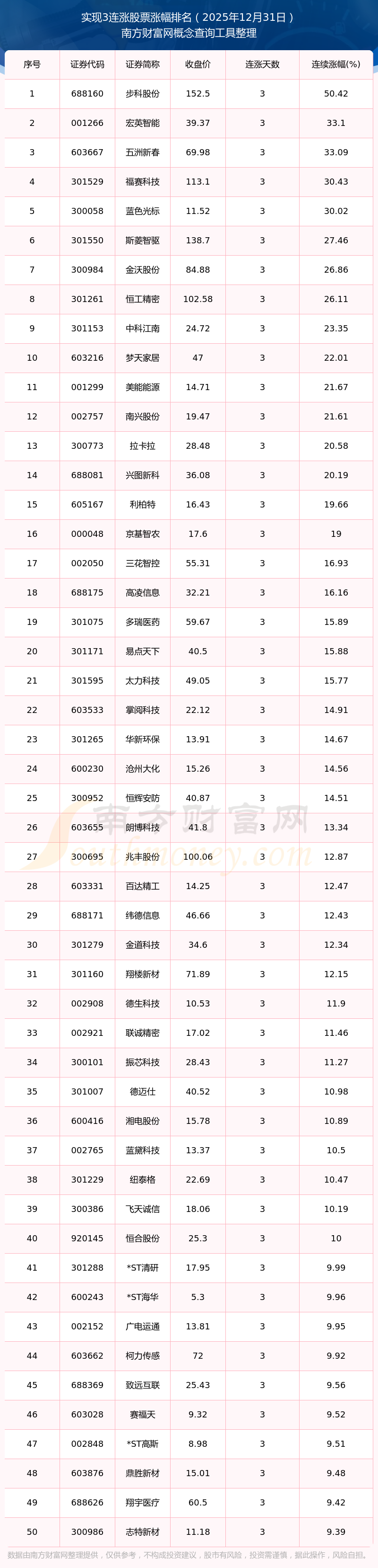 根据南方财富网概念查询工具数据统计,截止2025年12月31日收盘,共有206只个股实现3天连涨。其中连续涨幅较大的个股有步科股份、宏英智能、五洲新春等,连续涨幅分别为50.42%、33.10%、33.09%。