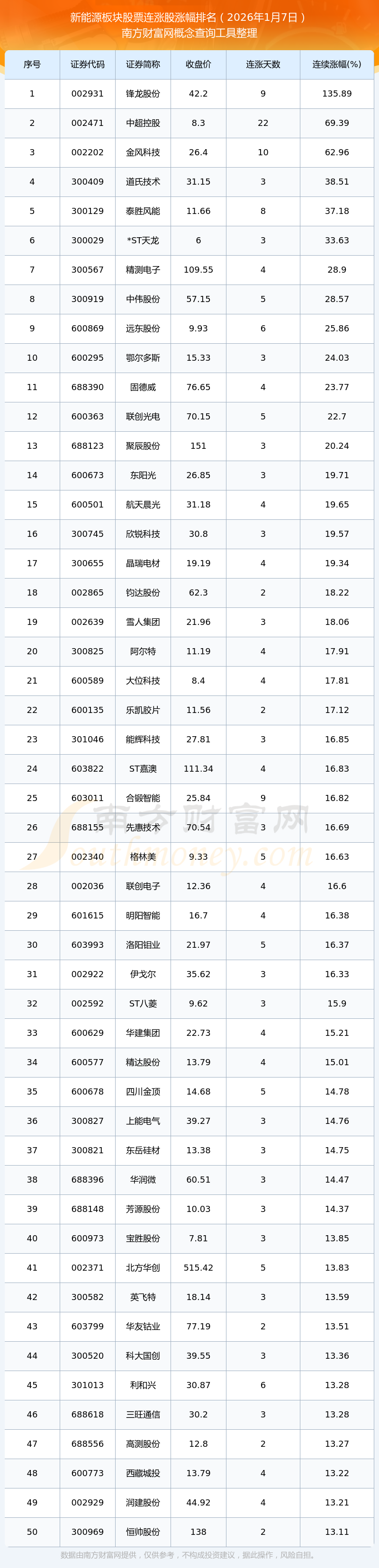 2026年1月7日新能源板块股票连涨股涨幅排名