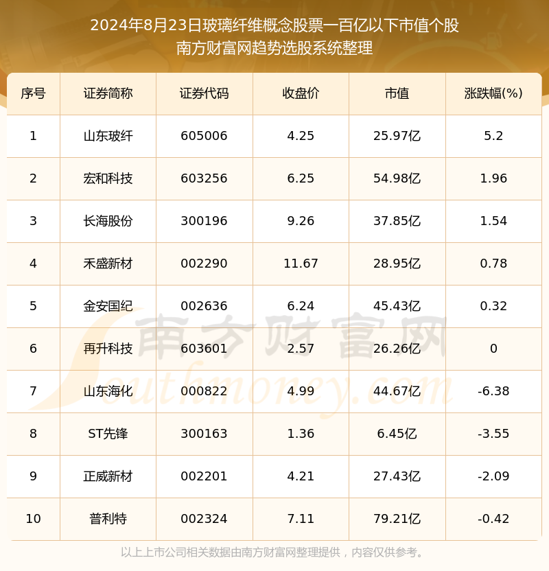玻璃纤维企业市值一百亿以下的股票有哪些?(2024年8月23日)